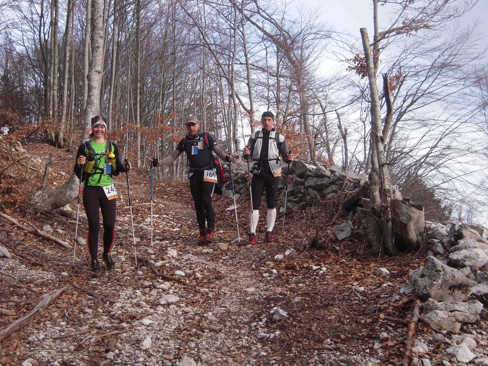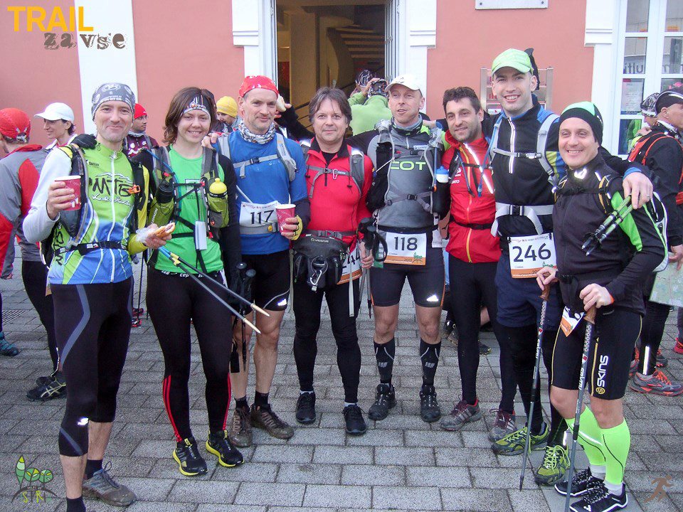 Kališče smo še praznovali Bojanin rojstni dan, kjer so me v hecu nagovarjali, da s tempom Dejana in Leona – “da se pir ne polije” 🙂 komot grem na Istrsko avanturo. Z Matjažem sva se že zdavnaj dogovorila, da se bova skupaj lotila tega podviga. V ponedeljek se res prijavim, čeprav so prijave že zaprte, ne komplicirajo in me dodajo nazaj na listo. V petek sva štartala iz Ljubljane šele ob devetih zvečer, pred tem pa sem namesto da bi še kako uro ali dve spala, bluzila po internetu, Toni je namreč končal svoj peti Marathon des Sables in čeprav je letos imel veliko smole, je vseeno končal na 30. mestu! On je razočaran, mi pa smo ponosni nanj! 🙂 Za 250 km po puščavi je potreboval 27 ur in 15 min…toliko kot mi za 104 km Istre (+4500 višincev), čeprav tega tisti moment še nisem vedela. Če bi mi kdo rekel, da bo tako dolgo trajala pot, mu ne bi verjela, kajti v glavi zacrtan maksimum prihoda v cilj je bil 20 ur, čeprav sem po drugi strani bila totalno brez pričakovanj. Malo čez polnoč prideva v Koromačno, parkirava in že se nama Boris pridruži pri piru. Ob petih zjutraj štartamo z avtobusi iz Koromačnega proti Buzetu, kjer je ob sedmi uri start na 104 km, na 100 milj (164 km) so štartali že v petek ob 21-ih. Zjutraj sem brez kave, pa še kmalu bi brez zajtrka ostala, kar mi povzroči glavobol in slabše razpoloženje, ampak vzdušje v štartnem prostoru me hitro naspidira. Ko zagledam Kristija, Perota in Robija (naše 100 miljaše;)), sem pa sploh happy, čeprav tudi zelo presenečena, saj sem pričakovala, da bodo najkasneje ob štirih zjutraj zapustili Buzet. Začetek je počasen, kmalu se začne hoja, saj je pred nami 10 km nabiranja višincev. Dela se krasen dan, toplo je in sonček sije. <3 Niti ura ne mine, pa se že srečamo z našimi prijatelji, veseli smo, da smo se našli in da lahko skupaj nadaljujemo (Kristi, Pero, Robi, Mirsad, Leon, Dejan, Simon, Tilen in mi, ki smo itak team: Boris, Matjaž in Roman). Kasneje se nam pridruži še Miro R.