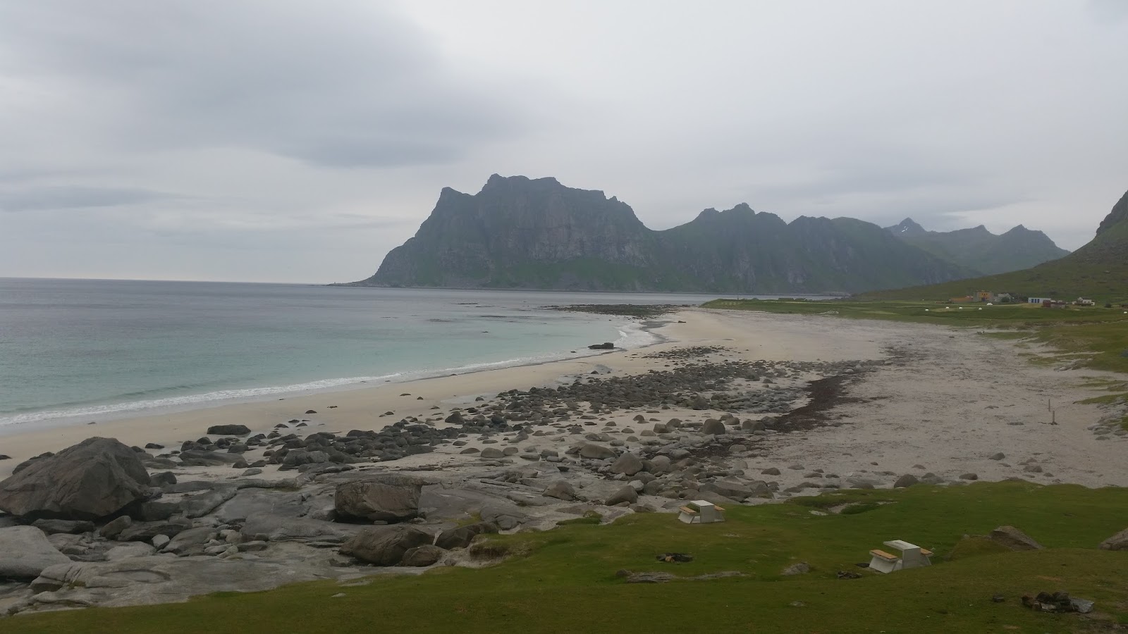 Naslednje jutro sva se vseeno odločila za vzpon na Galdhopiggen iz kraja Spiterstulen, čeprav vreme še ni bilo nič boljše. Možen je še en drug dostop, a je menda bolj nevaren zaradi ledeniških razpok. Narava tukaj je prekrasna, če bi bilo še kaj sončnih žarkov, bi bila pa božanska! Od glavne ceste do izhodišča sva imela 10 km makedamske ceste. Cesta je privatna in plačljiva, a sem prebrala na tabli, da se plača na koncu ceste na recepciji. Plačilu sva se izognila tako, da sva parkirala kakšen kilometer pred izhodiščem in šla peš naprej. Bila sva zimsko opremljena, z zataknjenim cepinom na nahrbtniku, večina pa jih je bila v kavbojkah, lahkih supergah, z majhnimi otroki in kužki. Po par sto metrih zaznam prve snežinke, in vse do vrha je snežilo. Mama mi je poslala sporočilo, da je doma 40 stopinj, da bi bila sedaj raje z menoj. Jaz pa sem hrepenela po soncu in toploti. Zaradi nizkih temperatur in naključij, se že dva dni nisva tuširala. Nisem se več dobro počutila, Toniju sem rekla, danes se pa tuširava, ne glede na razmere, najbolje da čimprej, že pri avtu, takoj ko se vrneva! Na vhu seveda ni bilo nobenega razgleda, nisva videla ledenike, je bilo je vseeno lepo. Šla sva med zadnjimi gor, prehitela pa vse po vrsti, veliko se jih je tudi obračalo, saj niso bili pripravljeni za te razmere, saj je na izpostavljenih mestih močno pihalo. Pri avtu nama pokaže 2 stopinji nad ničlo! Nič ne bo s tušem pri avtu. Sva se pa umila kasneje na sedmih stopinjah, saj sva vendar na poročnem potovanju! 😉 Noči so bile noro prijetne, nenehno sva se stiskala drug k drugemu, zaradi hladu mi je tako ugajala toplina mojega moža. Pred nama je bilo 1000 km do Lofotov. Vožnja je bila krasna, saj je tukaj malo prometa, praktično nič semaforjev, vozniki se držijo omejitev in ne divjajo, vozijo zelo umirjeno. V kraju Bodo sva naključno ujela trajekt ob enih ponoči. Bilo je še svetlo. Na trajektu sva opazovala sončni zahod in čez kakšno uro že vzhod, med tem pa seveda ni bilo čiste teme. Največja fascinantnost potovanja je bila nenehna svetloba, nikoli ni bilo trde teme! S spancem nisva imela težav, saj sva bila skoz po malem utrujena od poti, teka in potovanja.