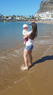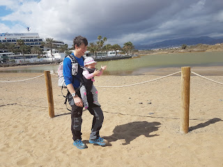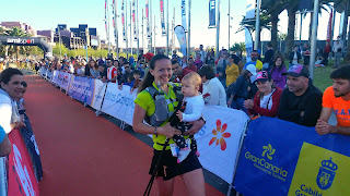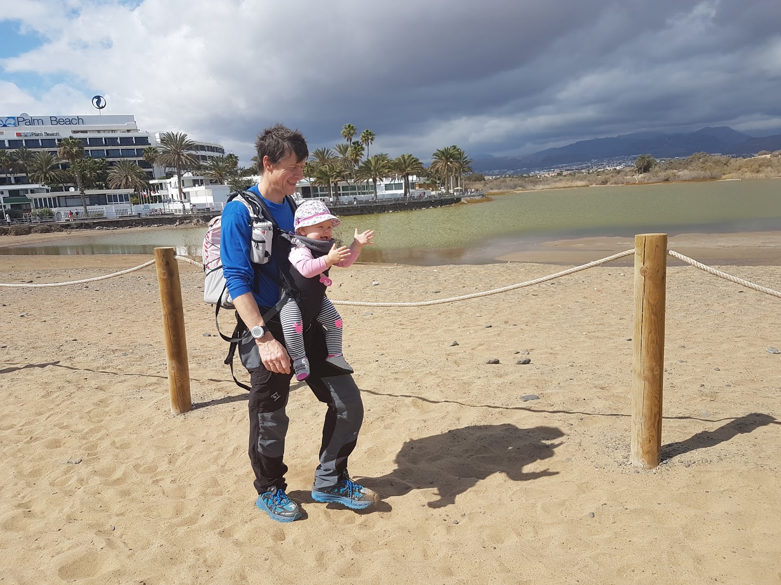 V torek 21.2. ob pol enajstih zvečer smo se odpeljali proti Milanu, od koder smo zjutraj imeli let. Hani je lepo prespala vso pot, ob treh zjutraj pa na letališču bila budna kot čuk in opazovala dogajanje ter od veselja vriskala na Zarine norčije. Prva ura letenja je bila čista katastrofa, Hani je bila preveč utrujena in je vreščala kot zmešana in se obema zvijala v naročju. Ne pomnim kdaj je nazadnje tako jokala. Ni želela ne čaja, ne mleka, ne druge hrane, ne dude…NIČ! Ko so se že meni začele solze nabirati v očeh od obupa, je končno omagala in zaspala. Nato je spala skoraj celo pot, slabe tri ure, na meni, jaz pa ves čas v skoraj nepremičnem položaju, da se nebi ponovila zgodba od prej. Na Gran Canarii smo na letališču prevzeli Škodo Fabio (Goldcar) in se opoldne že vozili proti Vecindariu v apartma, 14 km oddaljen od letališča ter 17 km do Maspalomasa, prizorišča Transgrancanarie. Čeprav me je bolela glava za znoret in sem bila utrujena, sem najprej šla na kratek iztek 6km, da preverim kakšne so moje noge in predvsem gleženj. Gleženj sem še vedno čutila, zato sem klicala Tonija, da imam vsega polno glavo, naj mi vrže kakšen evro čez okno, da nama grem po mrzlo pivo v trgovino. Kakšnega pa lahko spijem! 😉 Skuhali smo testenine, začela sem se spraševati kdaj neki pride Ivi in v isti sapi je pozvonilo na vratih .. glej ga, Ivija, s prve nas je našel! Zaradi spleta okoliščin smo si apartma delili z njim. Skupaj smo šli na kratek sprehod po mestu, potem pa domov jest, z Ivijem nama morajo makaroni z ušes začet gledat! 😉 Naslednji dan smo opoldne šli po štartno številko, Ivi je šel malo preteknit nogice, mi pa na sprehod po sipinah v Maspalomasu. Hani se je plazila po pesku in neskončno uživala. Jok in stok, ko smo jo dvignili iz peska. Ob štirih popoldne smo se dobili z ostalimi Slovenci, bilo nas je kar lepo število udeleženih na tekmi + njihovih družinskih članov/spremljevalcev (tekačev: 1 na 360, 11 na 126km, 1 na 65km, 10 na 42km in 1 na 17km). Ob prijetnem druženju je čas prehitro minil in že smo doma kuhali večerjo .. ponovno testenine, kakopak, najedla sem se pa tako, da sem se komaj premikala. Toni mi je računal plan. Predvidel je 18 ur 45 minut.