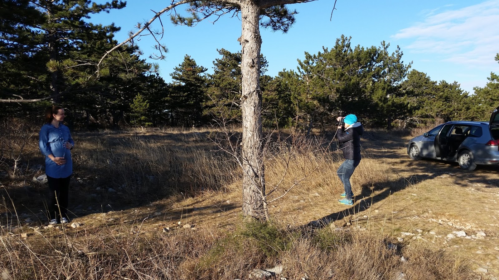 Naslednji dan, v nedeljo, sva bila dogovorjena s Tino Robba za “nosečniško fotografiranje”. Želela sem si lepih slikic s trebuščkom, za spomin na to prelepo obdobje in na srečo je Toni brez pomisleka ustregel moji želji. Ustvarila sem si nemalo skrbi, zaradi mraza in oblačil… kaj neki bom oblekla če bo tako mrzlo, pa še za nedeljo je napovedano oblačno vreme. Toni je preštudiral vreme in sklenil, da moremo proti Primorski, kjer bo lahko celo kakšna stopinja nad ničlo in kjer se je kazala jasnina, drugod po Sloveniji je bilo vsaj -6 stopinj in oblačno. Moja želja je bila Gorenjska in razgledi na hribe, ampak nimaš kaj… predala sem se dogodkom in Tini, s katero smo se takoj dobro ujeli. Najprej sem doma na stopnišču pozabila veliko vrečko oblačil za fotografiranje, kar mi je kliknilo, ko sva že bila v Ljubljani. Toni se je samo nasmejal in brez pritoževanja zapeljal na izvozu za Bizovik in obrnil nazaj proti Dolenjski, Tini pa tudi ni bilo težko počakati dodatnih 40 minut, da greva nazaj domov po stvari. Omg…a sem lahko še bolj raztrešena? 🙂