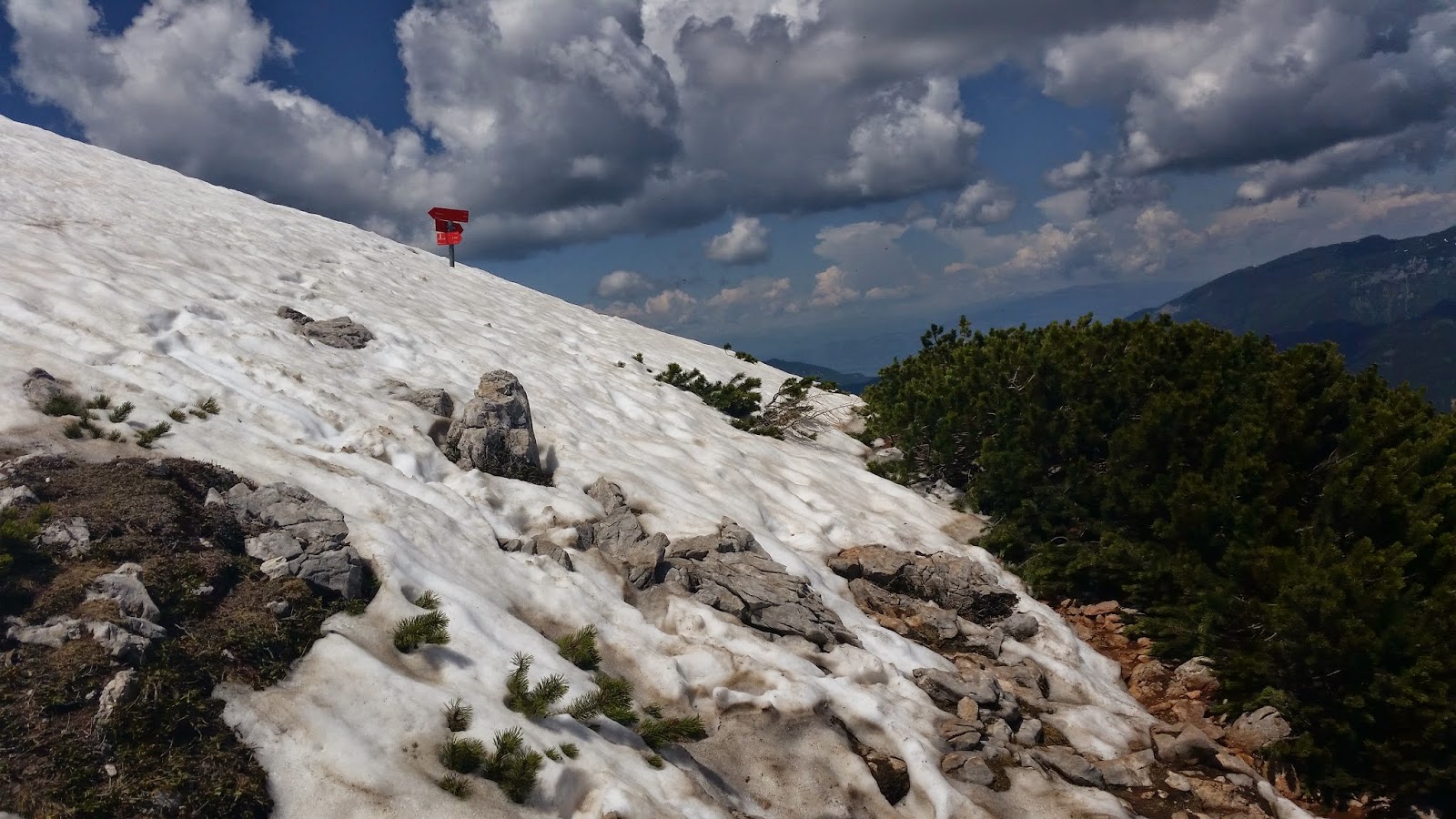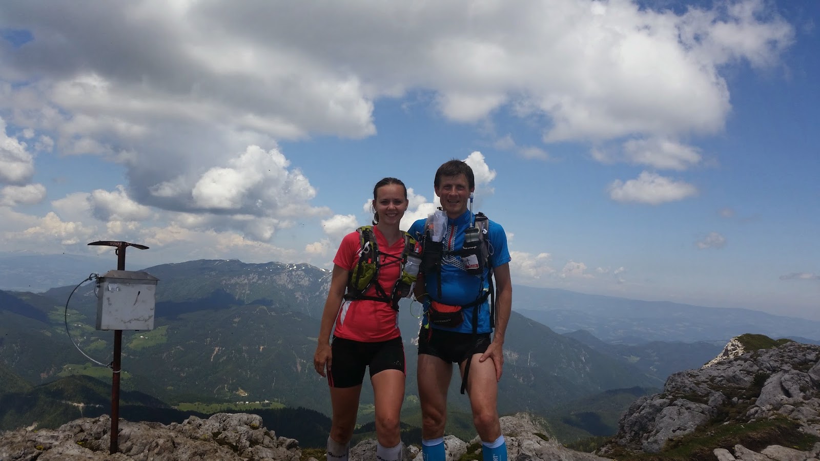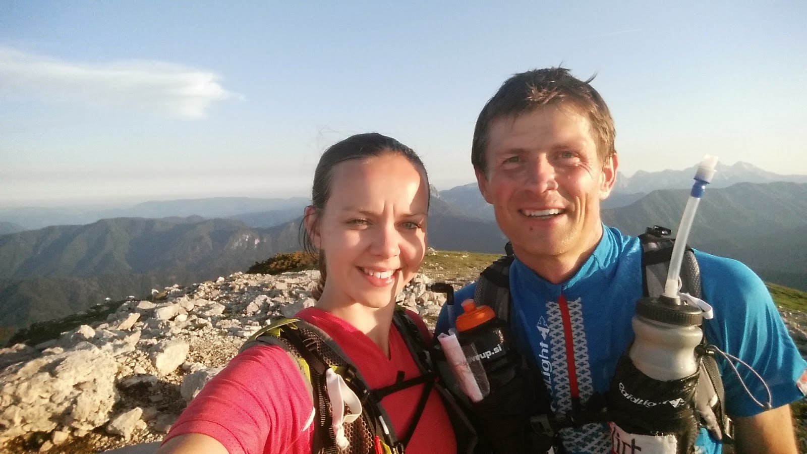 kolesarjenju v Španiji, kasneje pa tudi ni bilo prave priložnosti. Sicer sva s Tonijem za prejšnji vikend načrtovala malo drugačno avanturo, a sta mi Kristi in Barbara, ki sta pot prehodila teden dni pred nama, spet prebudila željo po K 24. Čakala sva na vremensko prognozo, ki je obetala vroč, sončen vikend – prvi pravi poletni vikend v letošnjem letu. Brez oklevanja sva se začela pripravljati na pot. Žal sem bila preveč obremenjena v službi, zato se je Toni mnogo bolj pripravil, nama sprintal karte in naštudiral celotno pot. Šla sva v petek takoj po službi. Spet je bil noro stresen dan in nikakor nisem mogla izklopiti in preklopiti na čisto drug film. Do Črne na Koroškem sva se peljala čez Jezersko, Pavličevo sedlo, Solčavo, kajti na prelazu Bukovniško Sleme (med Raduho in Olševo, na 53-em km) sva si postavila tranzicijsko točko. Self supported adventure sva imela. Med smreke sva “zakopala” vrečke s hrano in 6 litrov vode. Tranzicija je bila kakšen kilometer naprej od najvišje ležeče kmetije pri nas – Kmetija Bukovnik, 1327 m. Tam sva si želela skuhati kosilo, a naju je napadel velik roj muh. Šla sva naprej v Črno na Koroškem. Na kavi v baru Lunder, kjer hranijo knjigo vtisov popotnikov na K 24 sem šele dojela, kakšen izziv naju pravzaprav čaka zgolj čez par ur. Precej pozno še kuhava večerjo – testenine, kakopak. “Katka, daj mi pir iz one tamale hladilne torbe, prosim!”, odprem jo, in pograbim več plastenk vroče vode, namesto mrzlega pira – že doma se je spomnil, da se nama zvečer ne bo ljubilo pogrevat vode za tuširanje. Toni je še pakiral, pomil posodo, pospravil, jaz sem pa takoj po večerji padla v komo, čez dobre štiri ure bo zvonila budilka. 🙁 Če bi štartala tako kot jih večina, okrog desetih ali ob polnoči, mislim, da poti ne bi preživela, tako sem bila utrujena in zaspana. Da se čimbolj naspiva, je bila najboljša odločitev. Tako sva štartala ob 4:40 zjutraj. Nisva potrebovala prižigat čelke, se je že delal dan. Do Uršlje gore (2 uri 15 min) sem bila še malo sitna, na pol v snu sem tekla in korakala v hrib ter se spraševala zakaj hudiča si tako natempiram cel teden in potem še vikend!?! Na vrhu Uršlje Gore – Plešivec (1699 m) sem se ozrla naokrog, naredil se je prekrasen, topel dan. Občudovala sem krožno pot, ki je pred nama, vidni so bili vsi vrhovi, ki jih moreva še istega dne obiskati. Celotna pot mi je postala smiselna in negativne misli so zamenjale evforijo in veselo pričakovanje te nore dogodivščine. Za nič na svetu ne bi zamenjala za preležan vikend na kavču, kar sem si še par trenutkov prej želela, kajti toliko prekrasnih panoramskih razgledov med tekom in hojo, čudovitih poti, desetine kilometrov grmičevja še nezrelih borovnic je neprecenljivo doživetje, čeprav je istočasno vloženo precej napora. Iz Uršlje gore sva tekla previdno proti Smrekovcu. Kmalu je pot postala lepa, široka, tekaška, morda sem zato postala nepazljiva, se dvakrat spotaknila ob korenino in pošteno padla, je padlo tudi nekaj krokodiljih solz. Odrgnila sem si koleno, hujši je pa bil udarec v levi bok – do konca poti ni popustila bolečina, a ni bilo hujšega, na srečo sem lahko tekla. Ta del poti je bil dobro markiran, razen na vrhu Smrekovca so markacije izginile. Menda vsi ne grejo na vrh, ampak do Koče na Smrekovcu – ker na sami poti ne pobiraš štempiljk, nama je bilo v interesu obiskati vse omenjene vrhove in ne koče. Malo sva šla off road po grmičkih borovničk, pa sva hitro bila na drugem vrhu tega dneva, po šestih urah, na Smrekovcu (1577 m). Dobro razpoložena sva nadaljevala proti Raduhi. Le – te sem se najbolj veselila, ker še nikoli nisem bila na vrhu, sploh pa je ta pot del Slovenske planinske tranzverzale, ki jo nameravam v prihodnosti pretečt/prehodit, zato mi je vsak delček poti bil zanimiv in navdušujoč. Nek orientacijski plan, ki nama ga je Toni pripravil je kazal, da bi okrog enih popoldne morala že biti na Raduhi. Oznake planinskih poti sva razpolavljala – v povprečju sva potrebovala polovico manj časa, kot je bilo predvideno za planinsko hojo, če se je le dalo, sva tekla. Pot do Koče na Loki se je strašno vlekla, bila je resnično dolga, obletavali so naju roji muh, a na srečo niso bile hudo nadležne. Srečala sva se tudi z slabše očiščeno potjo podrtih dreves zaradi žleda. V kočah se nisva rabila ustavljat, saj sva imela dovolj hrane s seboj, vodo sva pa točila v potokih in izvirih na poti…bilo jih je čisto dovolj, nikoli nisva ostala brez vode. Skupno sva nosila tudi do 5 litrov vode… malo sva pretiravala, a res je bil vroč dan, čez 30 stopinj. Voda je bila dostopna na večih mestih zaradi večjih padavin v preteklih dnevih, v poletnih vročih suhih dnevih, pa na te izvire verjetno ne gre računati. Iz Koče na Loki do vrha Raduhe je vodila kar zahtevna skalnata pot… to naju je precej upočasnilo in sva komaj v prišla v predvidenem času. Saj se nama nikamor ni mudilo, a tega plana sva se držala kot da je nekaj svetega. 🙂 Tukaj prvič malo zalutava…ampak track v uri naju usmeri na pravo pot. Z navigacijo drugače nisva imela težav. Je pa priporočljivo imeti track v uri, da ti v primeru nesigurnosti pokaže pravo pot in ne zgubljaš časa in energije z iskanjem. Vročina je pribijala na polno, spila sem ogromno vode, apetita pa ni bilo nobenega. En sendvič s pršutom sem mlela skoraj pol ure, nato pojedla par tiramisu piškotov, tudi to je trajajo sigurno pol ure. Nobena hrana mi ni pasala, a vedela sem, da je potrebno vnašat kalorije, če ne, bom obnemogla. Na vrhu Raduhe (2062 m) sva naletela na zaplate snega. Cele kepe snega sem si vtirala med lase in se močila, tako mi je bilo vroče. Zelo lep razgled z vrha. Spust z Raduhe mi je šel dobro, čeprav je pot še zasnežena in je bilo treba iti previdno. Od kmetije Bukovnik naprej, naju je med smrekami čakala tranzicija. Vse je ostalo celo. Čisto preveč sva na