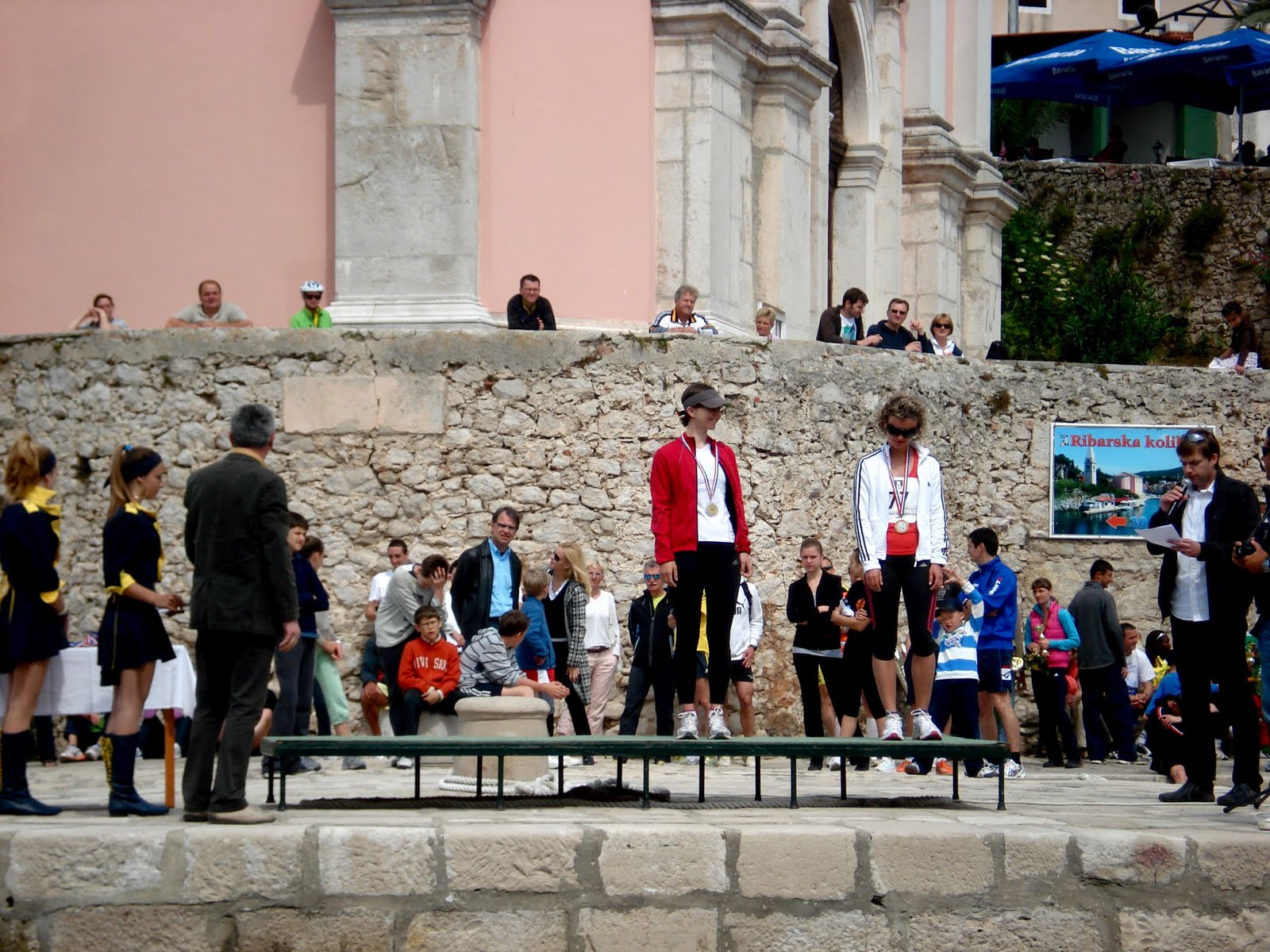 Dan kolesarskega počitka sva izkoristila za tek. Kolo sva potrebovala le kot transportno sredstvo do prizorišča maratona v Velem Lošinju in za kruzanje ob obali. Čudovit tek ob morju. Zjutraj nama je skoraj burja odpihnila šotor, saj nisva mogla zabiti klinov zaradi kamenja in deževalo je. Kmalu po startu pa nas je osrečil še sonček. Teklo nas je samo nekaj čez 80 in kljub začetnemu občutku, da bo vse potekalo bolj po balkansko (od št. 80 naprej nas ni imelo čipov, ker niso pričakovali take udeležbe), je na koncu izpadel kot fenomenalno organiziran maraton. Dali so vse od sebe in se maksimalno potrudili. Organizator je bil zelo zadovoljen, saj so tekli reprezentanti Srbije, Bosne, Madžarske, naš Primož Kobe (ki žal ni prišel do cilja), dva Etiopijca…skratka močna udeležba, kljub majhnemu številu ljudi. Opazila sem tudi slovenskega ultramaratonskega tekača Lojzeta Primožiča. Dobili smo majčke in medalje že ob prijavi. Na prvi tretjini poti, ko smo tekli čez center Malega Lošinja so imeli postavljen oder in muziko in celo fešto. Brali so naša imena in štartne številke, ko smo tekli mimo in navijali za nas in nas vpodbujali. Omg, noro je blo. In potem naprej v klančke ob obali Čikata. Najlepši tek v mojem življenju, brez muzike, ker mp3 je ostal doma in bilo je super. Kljub klancem in progi, težji od Sežane, sem v cilj prišla 1:49, kar je moj najboljši rezultat. Simon pa samo minutko za mano. Zelo sem bila zadovoljna. Zastojn so točili pivo, vino, brezalkoholne pijače, delili domač štrudelj, limone in pekli slastne ribe na žaru ter testenine in jagnjetino. Vse zastojn. Noro dobro vzdušje. Ogromno Slovencev. In ker je teklo zelo malo žensk, sem bila počaščena še z zlato medaljo v ženski kategoriji do 30 let. S tako slabim časom se mi je to lahko zgodilo samo tukaj:) Ampak je bil nor feeling in pogum za naprej. Mogoče sem se zato včeraj prijavila na Maraton treh src in sicer na 42 km, kot je bil prvoten plan. 🙂