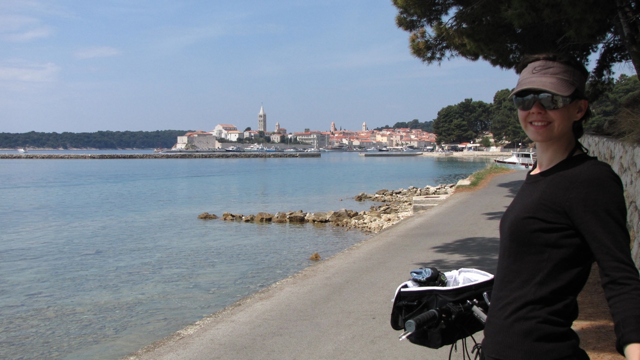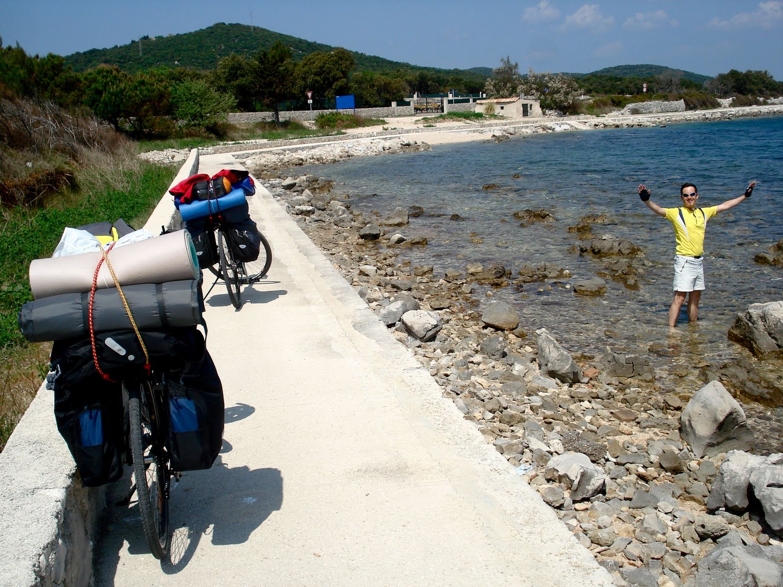 Slabo vreme, burja, klanci po Jadranski magistrali, dež. V kampu Straško postavila šotor par metrov od morja. Čudovit razgled. Mirno. V Novalji srečala znance, ki so tekli mimo in se samo za glavo držali, da sva s kolesom iz Slovenije in da greva še naprej. To nobenemu na kraj pameti ne bi prišlo, da bi bli kje drugje kot v nadstandardnem apartmaju. Nama je pa v šotorčku bilo prav toplo. Ptički so naju zbujali že ob svitu in že sva kuhala kavico in se prepuščala poti in dogodivščinam novega dne.