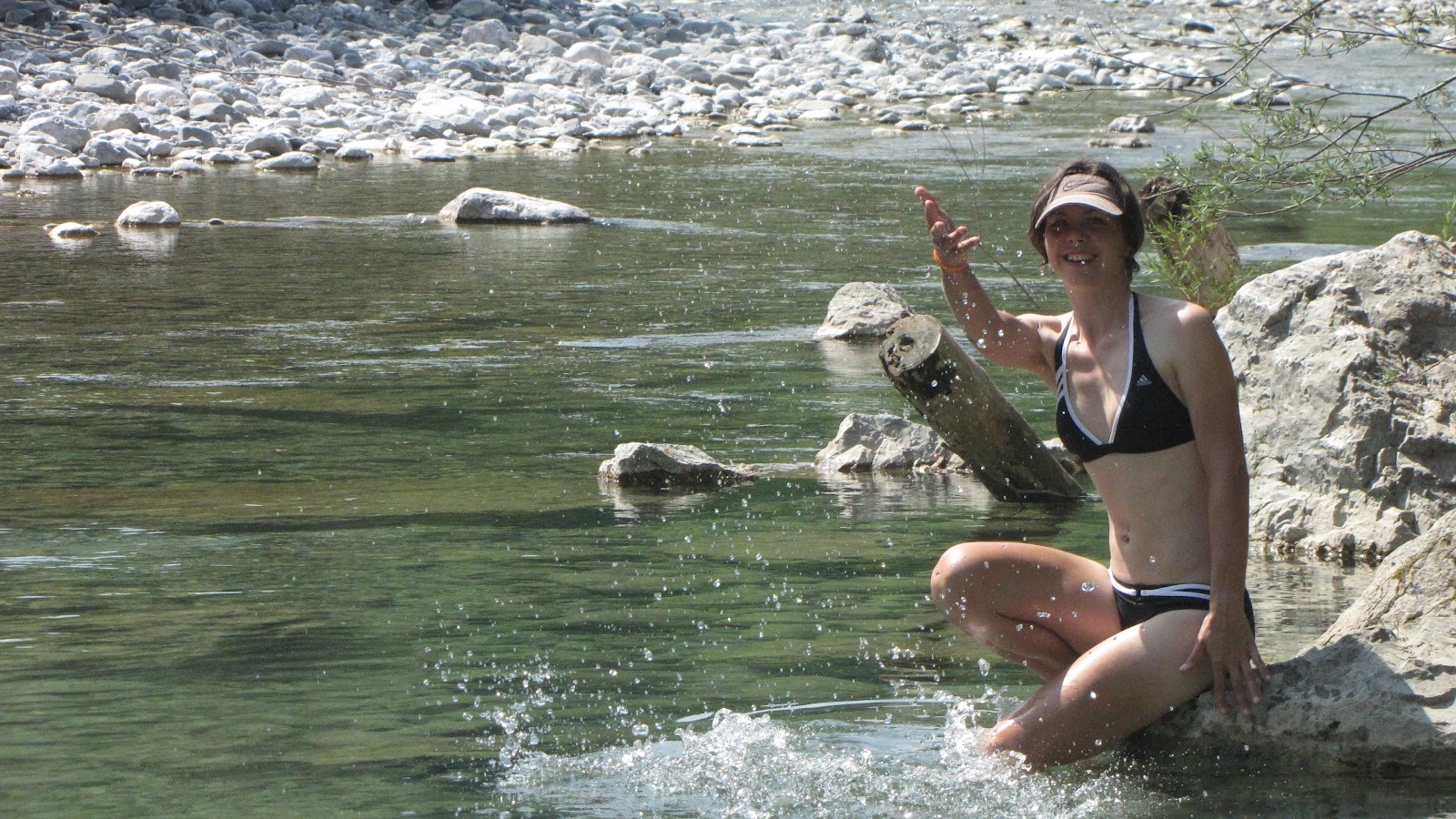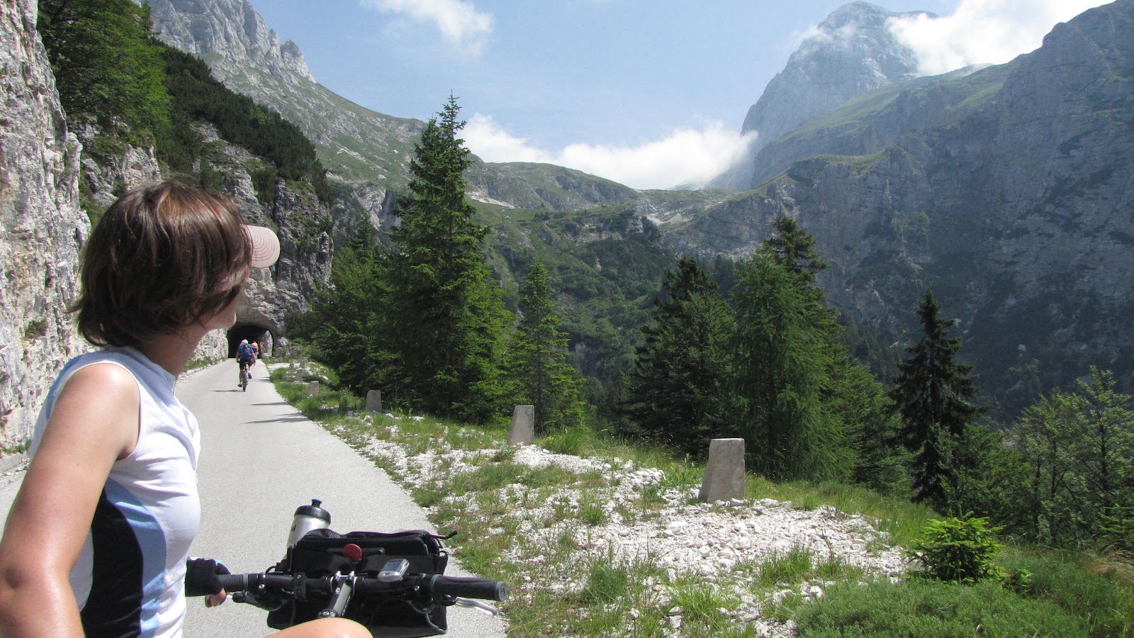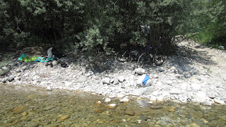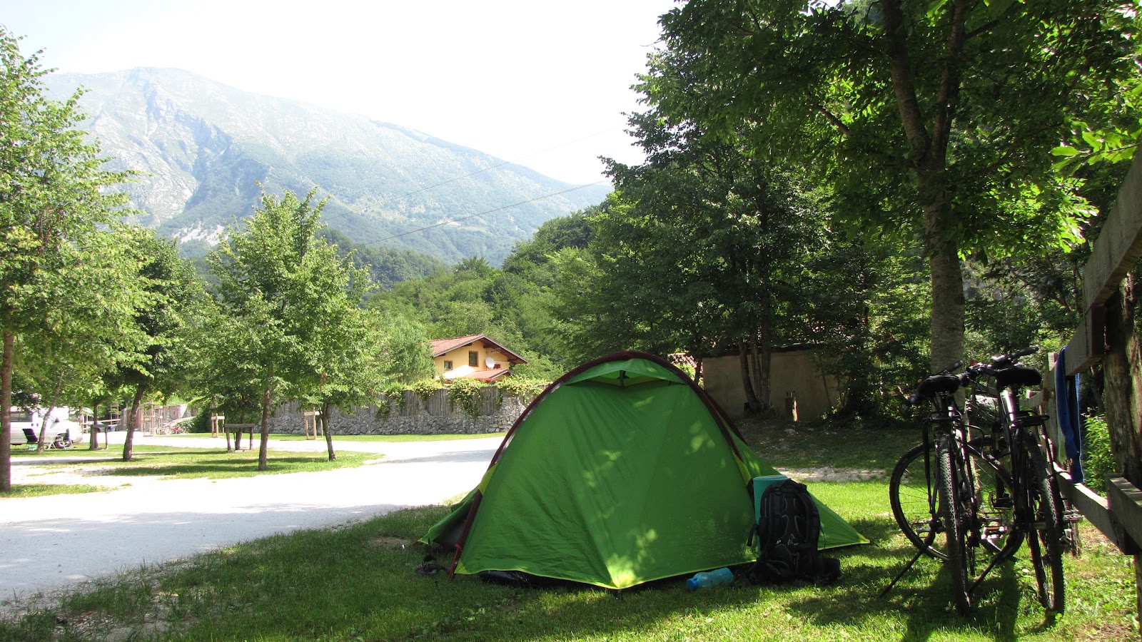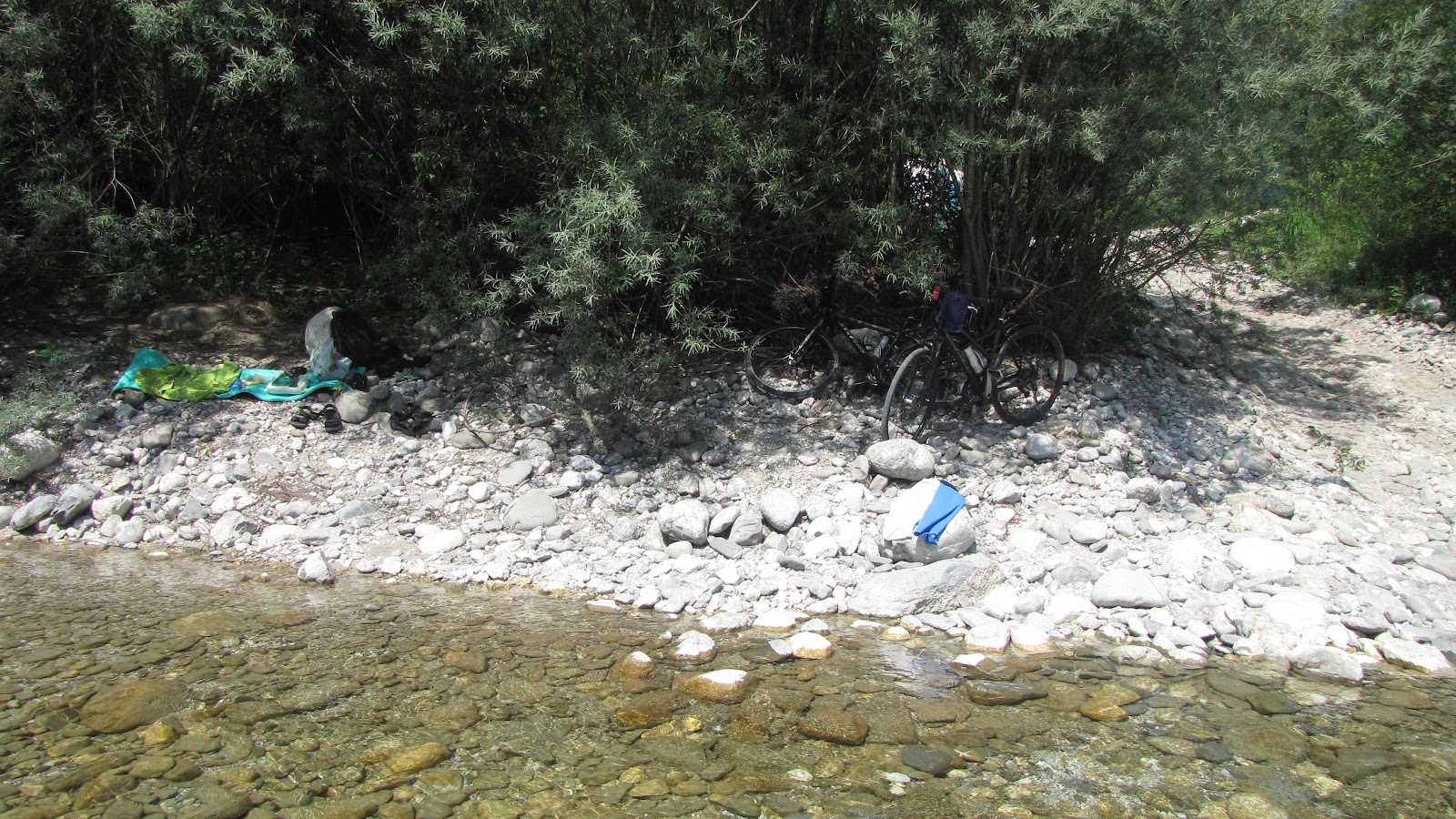Ker ne greva na Triglav, se odločiva za premik. Zgodaj zjutraj napakirava torbe, pospraviva šotor in se s težkim srcem premakneva iz te idile, ki jo ponuja Trenta in prijazen kamp z izredno prijaznim lastnikom. Sigurno se še vrneva! Ob 9:15 sva že v Bovcu, sestradana, saj sva brez zajtrka. Mercator zagledam že od daleč, kot da se mi je prikazala Marija. Lačna sem izredno tečna 🙂 Zavijeva v center Bovca, srečava dva iz vrha Kriških podov, malo se pogovarjamo in usmerita naju za kamp. Dopoldan imava že postavljen šotor v kampu Polovnik in cel dan pred seboj. Opereva cunje v pralnem stroju, kakšen luksuz! Vsi kampi v katerih sva bila do sedaj so imeli eno pomanjkljivost: tuš na žetone oziroma 50 centov, tople vode ti pa zmanjka v treh ali štirih minutah :/ Odločiva se za na easy dan okrog Bovca. Peljeva se do Čezsoče in odkrijeva krasno stransko cesto ob Soči. Opaziva slap Boka, gor pa ne greva, saj sva v japonkah. Raziskujeva makedamske poti in najdeva idiličen osamljen rokav Soče, kjer se ustaliva in bereva knjigo. Nazaj grede spet zavijeva v Bovec in želiva najti popravilo koles, saj mi skoz škrtajo prestave. Vprašava v trgovini z kajak in rafting ponudbo, terna, tip popravlja tudi kolesa! Zrihta mi za 5 eur, češ: “15 minut dela, kaj pa misliš, da rabiš kaj več da zrihtaš ta drekec pekec?” Faca 🙂 To bi v Ljubljani krepko več zaračunali.