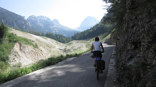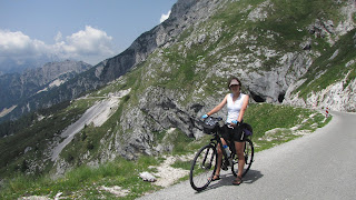 Najprej 15 km pretežno klanca skoraj na prelaz Predel iz Bovca do odcepa za Mangrtsko sedlo. Nato dodatnih 12 km klanca do konca naše najvišje ležeče ceste – na več kot 2000 metrih. S sabo sva furala pohodniške čevlje, saj sva nameravala še na vrh naše tretje najvišje gore (2679 m), vendar je bila tako slaba vidljivost in temni oblaki čez vrh, da ni imelo smisla. Raje sva se okrepčala v koči na Mangrtskem sedlu, malo zaspala v travici, dokler naju ni zbudil mrzel veter. Sledil je več kot polurni spust do Loga pri Mangartu ter naprej do Bovca. Roke so me bolele od bremzanja 🙂 Gor sva pa rabla štiri ure. Ker sva spet precej zgodaj štartala, tudi zato, da sva se izognila največji vročini, sva kmalu popoldan bila nazaj v kampu. Zelo dolgo bereva, kuhava, uživava.. Simon v mraku dela jogo in meditira, jaz pa hlastam Pamukov prvi ljubezenski roman. Prvič se zavedam, da se najin dopust počasi končuje, da bo kmalu treba spet domov in se vpeljat v ustaljen delovni ritem..in tole mi ni nič po godu :/