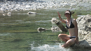 Simon ves čas opeva kamp Lazar v Kobaridu, zato zjutraj greva tja na kavo. Lačna sva, zato še naročiva slane palačinke, po katerih slovijo – z zelenjavo, tuno, špinačo ali mesom… res so odlične. Tako nama je všeč kamp in osebje in klima, da se odločiva kar ostat, tako da po 20-ih kilometrih na števcu pred 11-o uro dopoldan kampirava na novi lokaciji 🙂 Želela sva na Krn, ampak je tako zabasana vidljivost, da se odločiva dan preživet brez cilja. Pot naju zanese do slapa Kozjak, ki je od kampa oddaljen 30 minut hoje po urejenih gozdnih potkah. Ker je pasje vroče, se uleževa na klopce v gozdu in bereva knjigo ter hladiva pir v reki. Nazaj grede pobereva kolesa in jo v največji vročini mahneva do reke Nadiže, ki je ena najtoplejših alpskih rek. Zame še vedno mrzla, mrrrr 🙂 Najdeva osamljen zalivček, reka je plitva. Tolmuni, ki so globji so precej polni ljudi in otrok, ki se mečejo v vodo, midva pa iščeva mir in tišino. Popoldan se spustiva po potki, ki vodi tik ob najinem šotoru do Soče, kjer spet bereva knjigo in uživava ob glasni, deroči, smaragdni Soči. Kako je čudovita! Mimo se vozijo s kajaki in vpijejo od užitkov. Cel popoldan samo leživa, zato popokava stvari in se oblečeva za tek. Nisva valda zastojn vzela s sabo superg 🙂 Po dveh mesecih nenehnih bolečin v pokostnici in kolenu, kar mi je totalno zbilo voljo do teka, prvič spet uživam v teku in popolnoma brez bolečin. Kako sem srečna, Bogu se zahvalim, da lahko spet tečem! Ta teden sva imela splanirano tekaško popotovanje od Ljubljane do Pirana z Urbanimi tekači, pa jaz nisem upala, zaradi noge. Počutila sem se totalno brez tekaške moči. Ta dan sva tekla samo 5,5 km, ampak je bilo tako krasnih – do Tonovcovega gradu, mimo