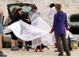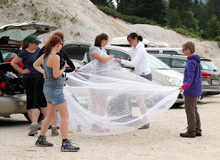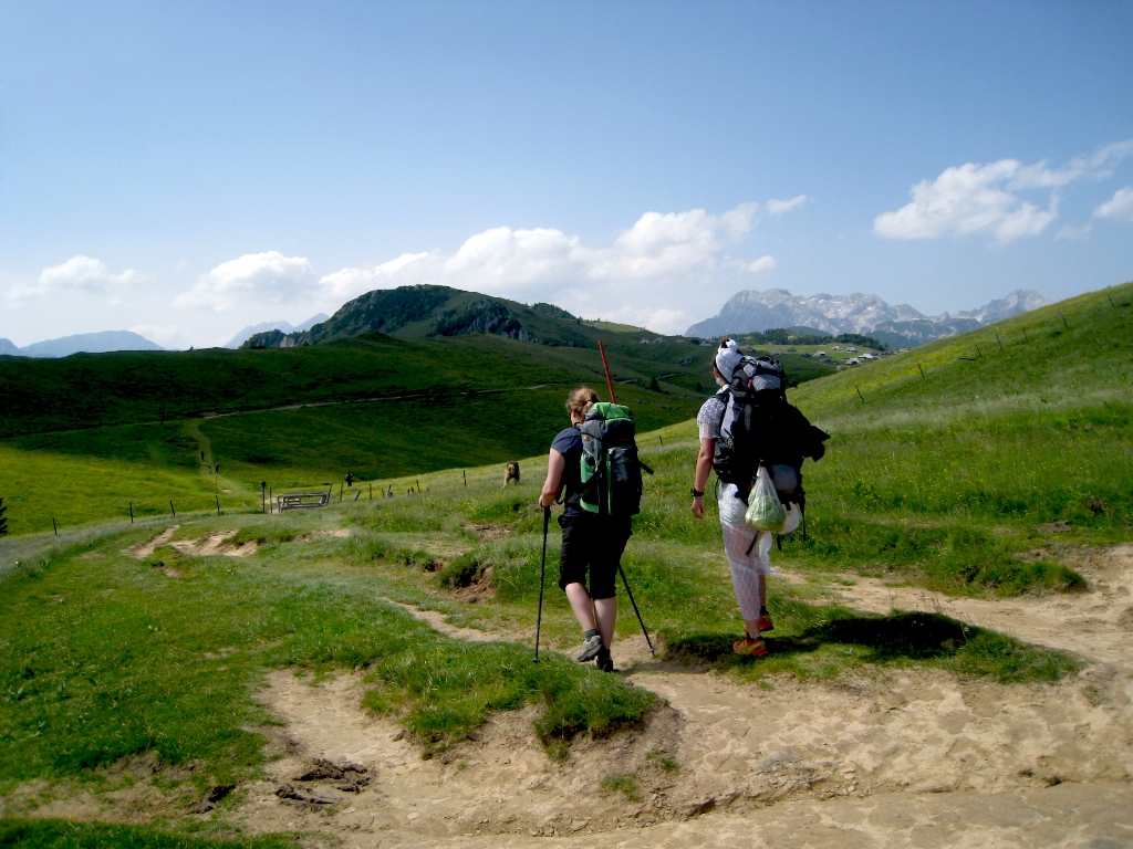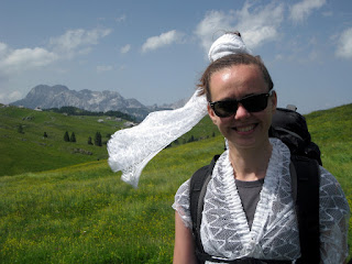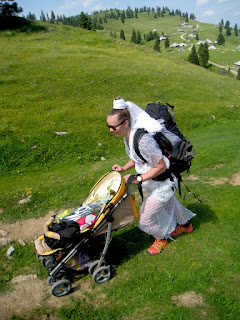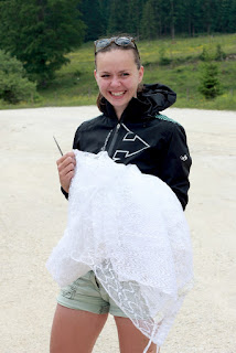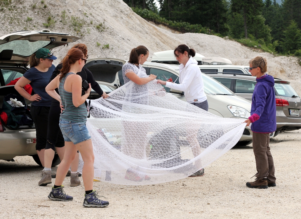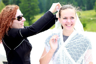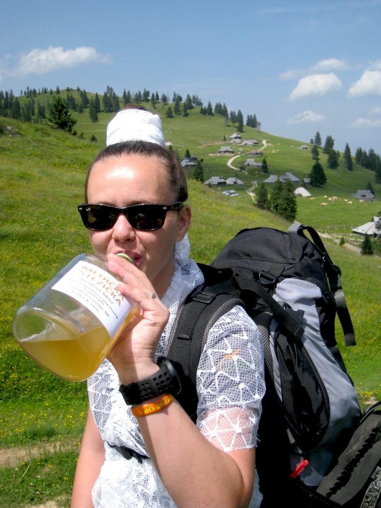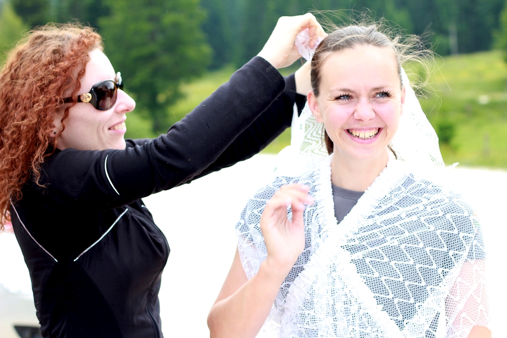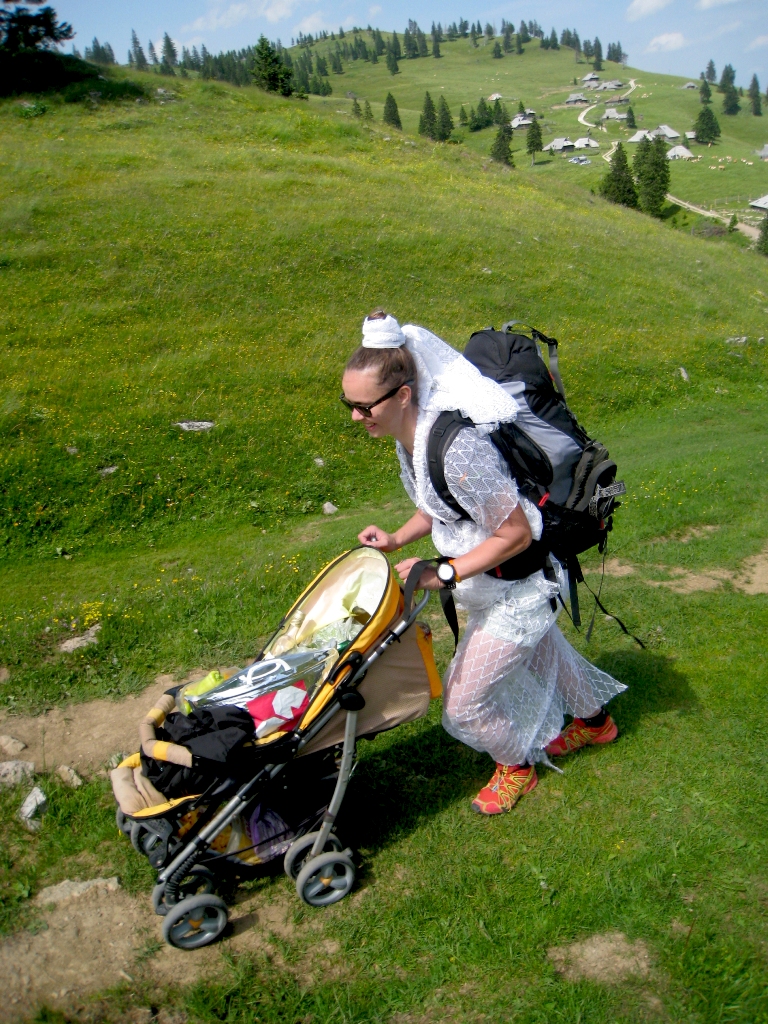 Moje prijateljice so vedele, da jih v primeru če se poročim, čaka dekliščina na Triglavu. Nekaterim izmed njim, sploh mojim najbolj zvestim iz Prlekije je to predstavljal velik stres in glede na okoliščine, da sva se s Tonijem za datum poroke dogovorila šele slab mesec pred samo poroko, se je nekako spodobilo, da omilim svoj namen, saj jim nisem dala dovolj časa za pripravo / trening. Tako sem rezervirala kočo na Veliki Planini – Zlati Ključ. V soboto, 13.6. smo se dobile na velikem parkirišču iz Kranjskega Raka. Takrat mi še ni bilo jasno, da bi se morale odpeljati še par kilometrov naprej do izhodišča Ušivec na nadmorski višini čez 1400m – če bi vedela, kakšno mi bodo ušpičile, bi glede izhodišča še trikrat premislila. Na spoznanje vseh nas – večinoma se punce niso poznale med seboj, smo degustirale najino domačo Medičko Stezičko in druge domače zvarke ter se v parih minutah čisto ujele. Čakale smo Matejo, ki je malo zalutala. Tina se nam bo pridružila pa kasneje, po službi. Bilo nas je devet nasmejanih in fenomenalno razpoloženih punc. Martina je imela govor za moj prehod v zakonski stan, ki seveda ne bo enostaven. Najprej sem si iz koluta zavese morala skreirati poročno obleko. Dobila sem škarje, nit in spenjač. Da bodo vsi mimoidoči vedeli, v kaj se podajam! Hotele so me osmešit, a uspelo mi je naredit krasno oblekco, v kateri sem preživela ves dan. Seveda so mi pomagale moje najboljše družice! To pa še ni bilo vse – kot zgleda se poroka enači s prehodom v družinsko življenje. Kmalu bom morala spoznati življenje z dojenčkom, zato sem morala za začetek razstaviti otroški voziček in ne se smejat, a nisem ga znala! 🙂 Še veliko stvari se moram naučiti v življenju. Za nameček so vse vzele planinske nahrbtnike srednje velikosti, jaz pa edina 60 L in več, pač največji kar ga premorem, tako da sem nosila težak ruksak, da sem ga komaj dvignila. V voziček smo pa nabasale večino pijače in nekaj hrane, niti je nismo imele kam stlačit v njihove lagodne nahrbtnike. V prvih metrih vožnje z vozičkom po kamnih je popokalo par pirov, ki so bili na spodnji mreži. Le – te je bilo seveda treba spraznit čimprej, da nam niso šli v nič. 😉 Napredovali smo izredno počasi. Že po par sto metrih sem bila ne samo izmučena, ampak izčrpana, s pulzom do rdečih obratov in si nisem predstavljala s tem vozičkom napredovati niti metra več. Punce niso hotele popustiti, kljub vsem mojim prošnjam in že skoraj solzam. Ponudile so mi pomoč, “zato pa imaš družice” na vsake par minut so se izmenjale, jaz pa nisem smela zapustiti vozička. Pri prvi pastirski koči ob robu gozda smo prosile, da nam posodijo štrik, ki smo ga napeljale odspredaj, da je ena bila za vozičkom, dve pa odspred, vsaka na svojem koncu vrvice. In ja – ta naložen voziček sem “pripeljala” na Veliko planino, vse do Domžalskega doma, kjer sem dokončno obupala od strašnega fizičnega napora. Medtem je minilo par ur. Dve, tri, ne vem, ta vikend čas ni obstajal. Bilo je zelo zabavno, vse skoz smo se ustavljale, kaj popile seveda in se hecale, a zame je bilo res težko – vlekle in nosile smo voziček po koreninah in skalnati poti, 600 + višinskih metrov. Naprej od Domžalskega doma je bila pa pot res krasna, brez vozička sem se počutila lahka kot peresce, svobodna, čeprav je nahrbtnik še zmeraj bil peklensko težak. Imele smo prečudovite razglede in Velika Planina je res en košček raja na zemlji. Ustavile smo se v Zelenem Robu, kjer so nas zaposlene punce izjemno pozitivno presenetile in se potrudile za nas. Ker sem mislila, da nam bo morda zmanjkalo pijače za večerni žur, so nam zrihtale cel plato iz doline po trgovinski ceni in so nam ga dostavili z gondolo, medtem ko smo se spustile do naše koče pri gondoli. Naslednji dan sem dobila od njih darilce – Trdi sir Trnič z Velike Planine, okrašen s posebnimi ornamenti, po izročilu bi jih naj podarjali svojim izvoljenkam kot dokaz ljubezni in zvestobe. Zaradi vse kalvarije z vozičkom, smo za par ur zamudile srečanje z oskrbnikom koče. Na srečo nam je pustil ključ v vratih in je bil razumevajoč. V koči smo preživele krasen večer, spekle smo perutničke in pripravile solato ter se pogovarjale in plesale dolgo v noč. S Tino sve spale pod zvezdnatim nebom v spalkah, čeprav so menda postelje bile izredno udobne. Zjutraj smo pozajtrkovale in cel plato pira, ki se ga itak skoraj nismo pritaknile, tovorili spet nazaj v dolino. 🙂 Tudi naslednji dan sem imela grozno težak ruksak. Ampak zelo dobro sem prestala to izkušnjo in samo upala sem lahko, da jo bom prestala tudi naslednjo soboto, ko bom na Pušeljc trailu pretekla 100 km, 6000 višincev, ter se takoj po teku poročila z mojim Tonijem. Postala bom žena tako krasnega fanta.