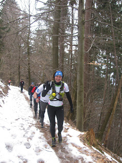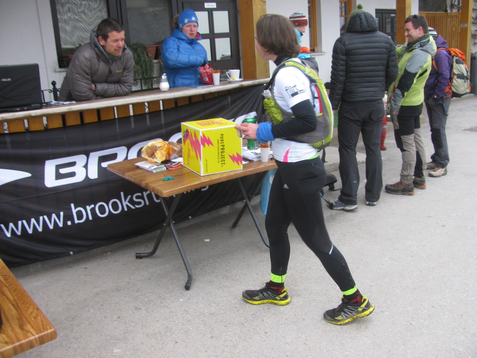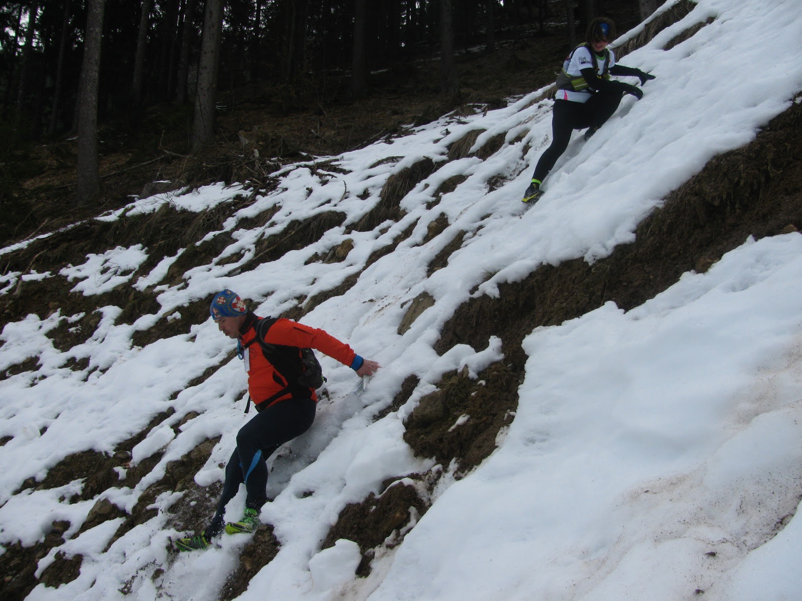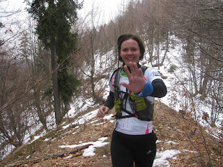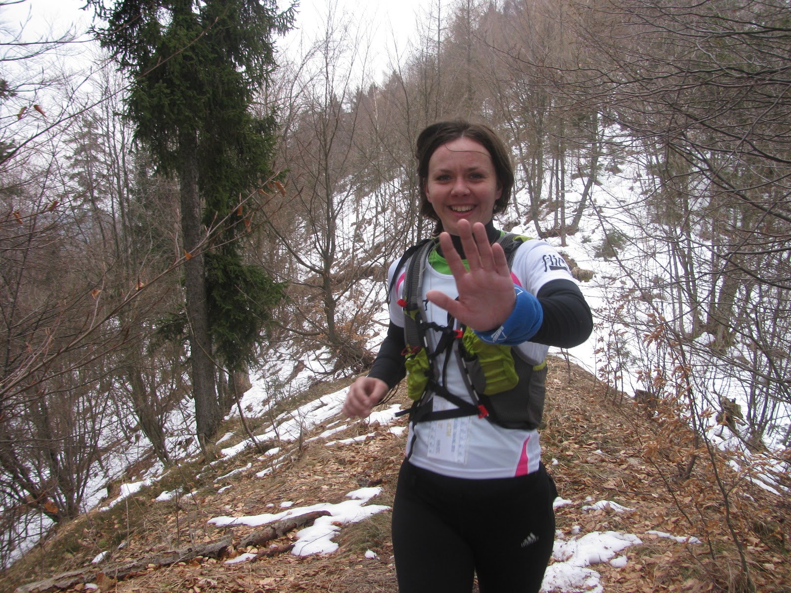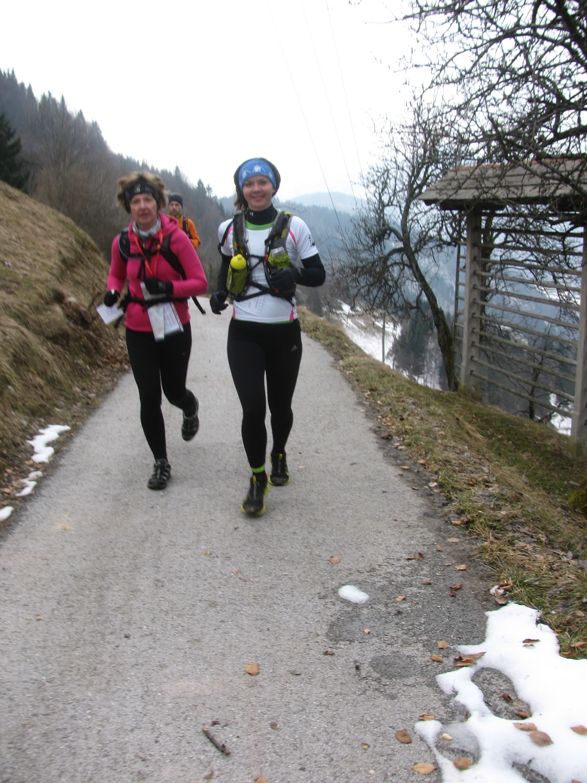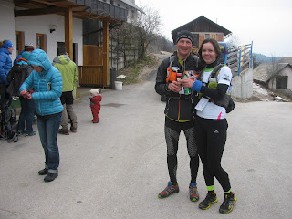 Na Križni Gori blizu Škofje Loke se je v soboto 23.3. pričel letošnji prvi treking Slovenske treking lige. Že jutro je bilo za naju orientacijsko pestro. Kakšne 4 km sva se odpeljala predaleč, med zavzetim pogovorom sva spregledala tablo za Podlubnik oz. Križno Goro. Postane nama čudno predaleč in zavijeva ob potoku desno, čimprej je mogoče. Voziva v klanec, dokler ne prideva do žage, kjer se cesta konča..juhej 🙂 Tonijev raziskovalni duh nama popestri vožnjo še po nekih stranskih, makedamskih poteh, preden prideva do prave ceste in kmalu zagledava Gostilno pri Boštjanu, že naju usmerjajo kje naj parkirava. To je to! Pa še med prvimi sva prišla. 🙂 Smeha ne manjka, kar razbremeni mojo “živčnost”, saj to je bila moja prva treking izkušnja, nisem vedela kaj pričakovati.  Že dobra dva meseca, odkar sem staknila poškodbo, nisem tekla takšne razdalje, sploh pa nimam od takrat nobenih višinskih kilometrov, kar je bil še dodaten razlog, da sem bila zjutraj že pred budilko budna kot sova. Kmalu smo štartali, midva pa niti karte nisva utegnila naštudirati pa tudi predstavitev trase preslišiva, zamudiva. In že akcija!! Na razpolago so bile tri kategorije: aktivna – cca. 10 km, pohodniška – cca. 20 km in ultra – cca. 40 km (in cca. 2000 višincev), za katero sva se brez pomisleka odločila s Tonijem. Dobimo vsak svojo karto s 15.-imi kontrolnimi točkami, do katerih moramo priti. Skupno se nas je trekinga udeležilo nekaj več kot 200 tekmovalcev. Začetni del je bil orientacijsko bolj zahteven, sama bi se težko znašla, saj sem bila čisto nepripravljena. Šele po drugi kontrolni točki sem bolj začela gledati na karto in se ukvarjati z orientacijo. Pot je potekala nekako tako: Križna Gora, Lavtarski vrh, Ševlje, Topolje, Selca, Kališe – Sv.Križ, Sv. Mohor (949 m.n.m.), Špičasti hrib, Kovk, Moškrin, Križna Gora. Okrog dveh ur teka mi začne zmanjkovati moči, začnem se spraševati kje je še sedma, osma ura, ki je nekako optimalno predvidena za cilj. Um se obremenjuje še z mislijo, da sva počasna, čeprav se obenem zavedam, da Toni jemlje tek samo kot dober trening v okviru priprav na Marathon des Sables (še slaba dva tedna do štarta) in ne kot tekmovanje. Od vasi Ševlje zagrizemo v klanec, hojo izkoristim za vnos potrebnih kalorij. Naslednje minute so še težke, a na sedmi kontrolni točki oživim. Ne vem kaj me je bolj predramilo, sporočilo, da nama pravzaprav ne gre slabo, da sem prva med ženskami, ali mrzla Coca Cola, ki je bila božanska osvežitev, kot darilo iz nebes. 🙂 Sploh od Sv. Mohorja, ki je naša najvišja višinska točka, tečeva, kot da lebdiva po zraku. Pogovarjava se, oba polna evforije, a se v istem trenutku zavedam, da me je ta občutek že velikokrat zavedel in da se moram nazaj prizemljit. In res v navalu te evforije prvič za hip izgubiva orientacijo. Treba je najti 11. KT- Kovk, midva pa tečeva mimo. In panika!! “Kje sva, predaleč sva?!?” Skušava se skulirati in najti pravo pot. Zagizeva v klanec, direktno med vejami in drevesi. Klanci me počasi načenjajo, hoja je vse bolj počasna, čutim težke stegenske mišice, a grizem, grizem.. Toni teče naprej in kmalu slišim vzklike veselja, da je našel kontrolno točko, ki sva jo kmalu zgrešila. Na vrh za nama pride tudi Miha, ki ga kasneje v gostišču spoznava in mi poda koristne informacije glede Adventure Race-a. Ponudi se, da naju slika. Toni že cel dan samo mene slika (ima veliko rezerv in časa, medtem ko se jaz matram :)), končno prideva do skupne slikce. Na 12. KT spet dobiva podatek, da sem prva od žensk, zato nadaljna energija gre predvsem v ohranitev tega rezultata. Pred nami pa je še en klanec. Zadnji del je precej tricky, a se odločimo iti po cesti do cerkve, ki jo gledamo v daljavi, nekateri grejo že prej desno po gozdu direktno. Kasneje se izkaže, da je naša odločitev bila odlična, saj je KT še v gozdu, mi smo šli direktno mimo. Pred nama je še zadnjih 1,5 km. Tik pred ciljem odpreva pir, Toni ju ves čas nosi v nahrbtniku, težkem 8 kg. Tonija sprašujejo kje se je obiral tako dolgo. 🙂 V cilj sva prišla s časom 5 ur in 46 minut. Ampak se ne sekirava za to, imela sva se odlično. Nisva bila na tekmi, ampak na enem prekrasnem tekaškem doživetju, ki nama je obema minil neizmerno hitro. Uspelo mi je obdržati rezultat vse do konca in za nagrado sem dobila tekaške superge Brooks Cascadia, prav tiste, ki sem jih gledala pred startom. Super darilo, sem jih že sprobala, sicer na tekaški stezi in so se super obnesle. Preoblečeva se, sledi razglasitev rezultatov in podelitev nagrad, skoraj jih zamudim, saj se mudiva za šankom 🙂 Čaka nas še odlična hrana – gobova juha z ajdovimi žganci, zame pa odličen golaž, malo poklepetamo in se poslovimo. Odlična organizacija, krasen dogodek. Nedvomno se vidimo še na kakšnem trekingu! <3